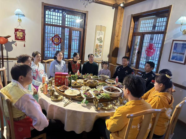 “说一千,道一万,三十晚上吃顿饭。”年夜饭是中国人刻在骨子里的团圆仪式,这场为天南地北长白人筹备的新春家宴,更是将这份团圆情拉满。来自各地的长白游子、坚守岗位的民警、扎根边城的志愿者与本地各族乡亲相邻而坐。你一言我一语分享着一年的收获与期盼:有人讲述在外打拼的见闻,有人诉说守护边境的坚守,有人畅谈服务基层的感悟,长辈们叮嘱着平安顺遂,年轻人送上祝福与期许,举杯共饮的清脆声响、此起彼伏的欢笑声、暖心的叮嘱声交织在一起,让长白的冰雪间,漾起浓浓的烟火气与团圆味,也让每一位异乡人都找到了家的归属感。