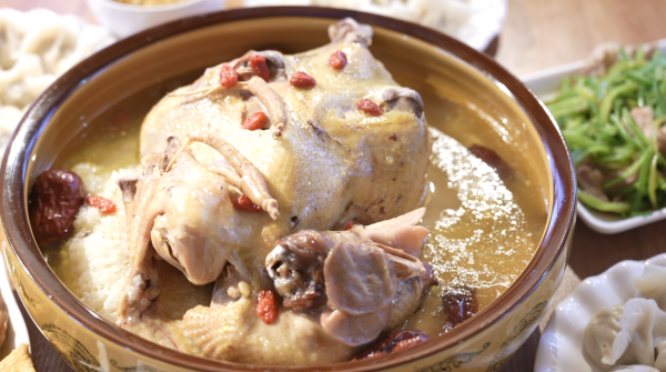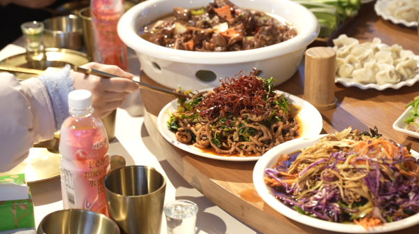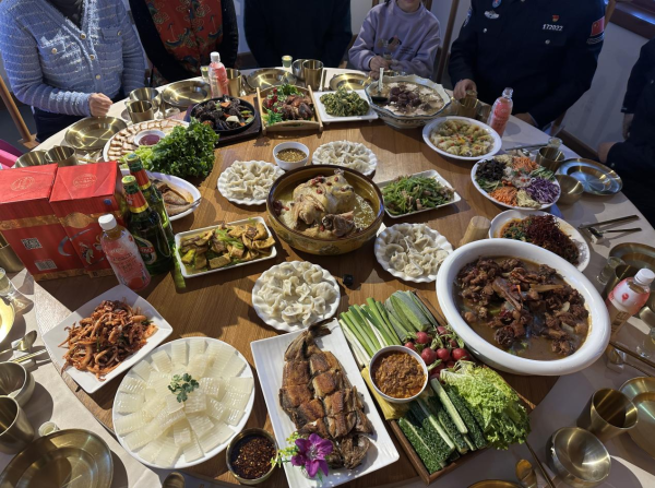 传统四素菜品同样寓意深远,芹菜寄寓“勤劳生财”,愿脚踏实地的耕耘皆有收获;白菜取“百财”之意,象征明明白白发财、清清白白做人;韭菜以“久”为韵,寄托着家人长长久久、团圆岁岁年年的心愿;豆腐谐音“兜福”“纳富”,是对拼搏与收获的美好期许。四荤则以鸡、鸭、鱼、肉为核心,鸡谐“吉”,祈愿新岁吉祥如意、万事顺意;鸭兆春归,寓意新春早临、日子蒸蒸日上;鱼为压轴,“吉庆有余”“连年有余”的美好寓意,让富足与好运绵延;猪肉代表着寻常人家最踏实的幸福,象征丰衣足食、生活殷实。大家一边品尝着地道的长白风味,一边细数菜品背后的故事,老人们耐心讲解着家乡年菜的讲究,年轻人认真聆听、频频点头,暖意与温情在筷起筷落间缓缓流淌。