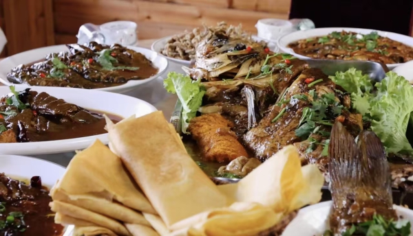 三道沟镇的农家乐里,柴火大锅是主角。“笨鸡炖榛蘑”“酸菜炖排骨”“铁锅炖豆角”“铁锅炖江鱼”等东北农家菜,用传统的铁锅和柴火慢炖,锅边贴一圈玉米面饼,热气烘得煎饼金黄酥脆,掰一块蘸汤吃,既有粗粮的扎实,又带炖菜的鲜香。手工制作的大煎饼是另一大亮点——玉米面糊在铁鏊子上摊开,薄如纸却韧性强,可裹菜、卷葱或直接食用,粗粮的香气让人回味无穷。