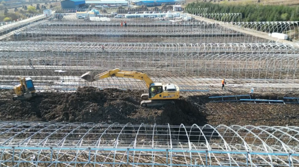 在大石人镇大石人村的智慧农业示范基地项目建设现场,多台机械正有序作业,工人忙着搭建温室钢架。基地核心区域内智能温室单栋面积从960平方米到1056平方米不等,将全部采用“钢结构+双层保温膜”设计,搭配太阳能集热系统,可有效应对冬季低温天气,保障作物全年生长,相较于传统种植模式,种植效率将提高3倍以上。