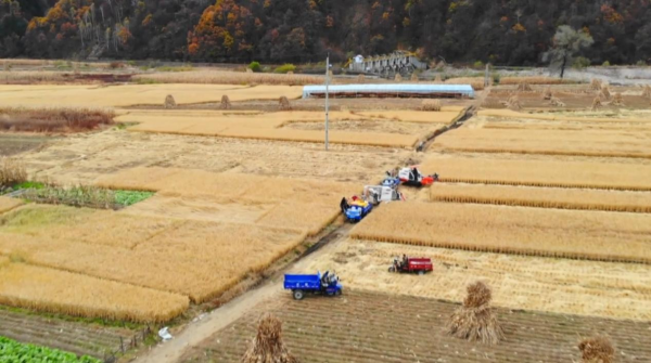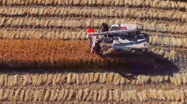 深秋的阳光,像融化的金子,温暖地洒在田野间。在临江市蚂蚁河乡贾家营村的水稻田里呈现出一片繁忙景象,收割机在田间来回穿梭,忙碌地进行水稻收割作业。