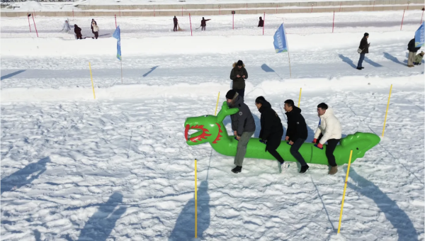 室外赛场,竞争与欢笑交织。“雪合战”作为经典的雪上团队对抗项目,考验着队员的策略与投掷技巧;“雪地龙舟”则在银装素裹的场地上演绎着别样的速度与激情,彰显团队的默契配合;“足球绕杆”项目则让参与者在冰雪之上展现灵活的脚法与控球能力。