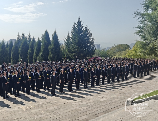 秋日的北山公园内,松柏苍翠,“四保临江”纪念碑巍然耸立,“人民烈士浩气长存”八个金色大字熠熠生辉,气氛庄严肃穆。上午9时30分,现场奏响雄壮的《中华人民共和国国歌》,激昂的旋律回荡在纪念碑上空,全体人员肃立,表达对祖国的无限热爱与对英烈的深切缅怀。国歌唱毕,全场脱帽,向为中国人民解放事业和共和国建设事业英勇献身的烈士们默哀,寄托无尽的哀思。