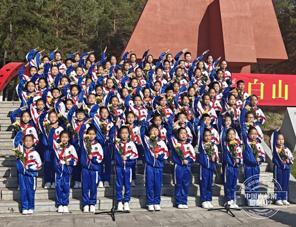 默哀毕,少先队员列队整齐,献唱《我们是共产主义接班人》。清脆嘹亮的歌声,表达了新时代青少年继承革命先辈光荣传统,向着理想勇敢前进的坚定信念。