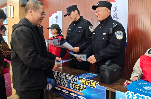 反诈宣传台前,县公安局民警通过讲述发生在每个人身边的典型案例,向群众宣传防范电信诈骗知识,切实守好群众“钱袋子”。