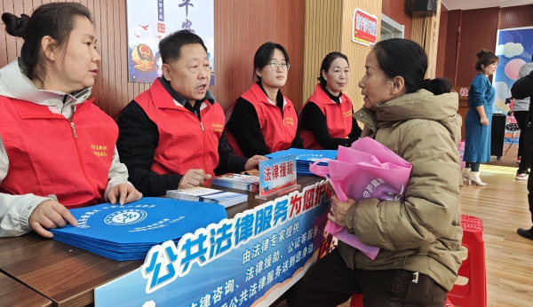 公共法律服务宣传台前,由县委政法委司法局机关组建的法律服务队伍耐心向群众普及法律常识、解答法律难题、提供预约办理,将优质公共法律服务送到群众身边。
