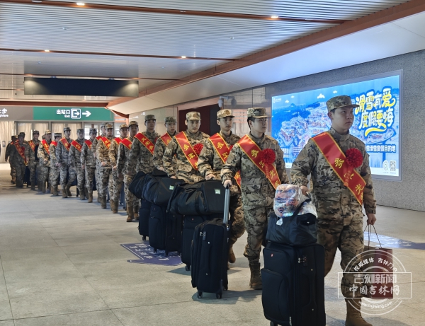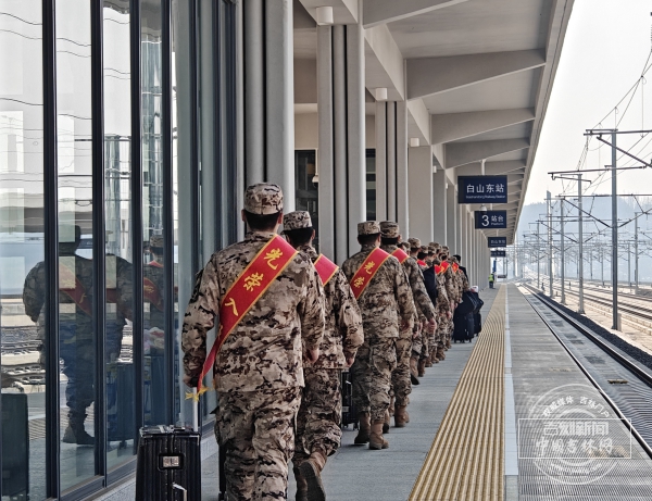 随着“出发”一声令下,新兵们告别亲友,步伐坚定、依次登车。列车鸣笛启程,载着青年的热血赤诚,载着家庭的骄傲期盼,载着家乡的深情嘱托,向着远方飞驰而去。这一刻,青春与钢枪相约,故乡与军营相连,崭新的高铁线,正见证着一批白山好男儿的强军报国路。